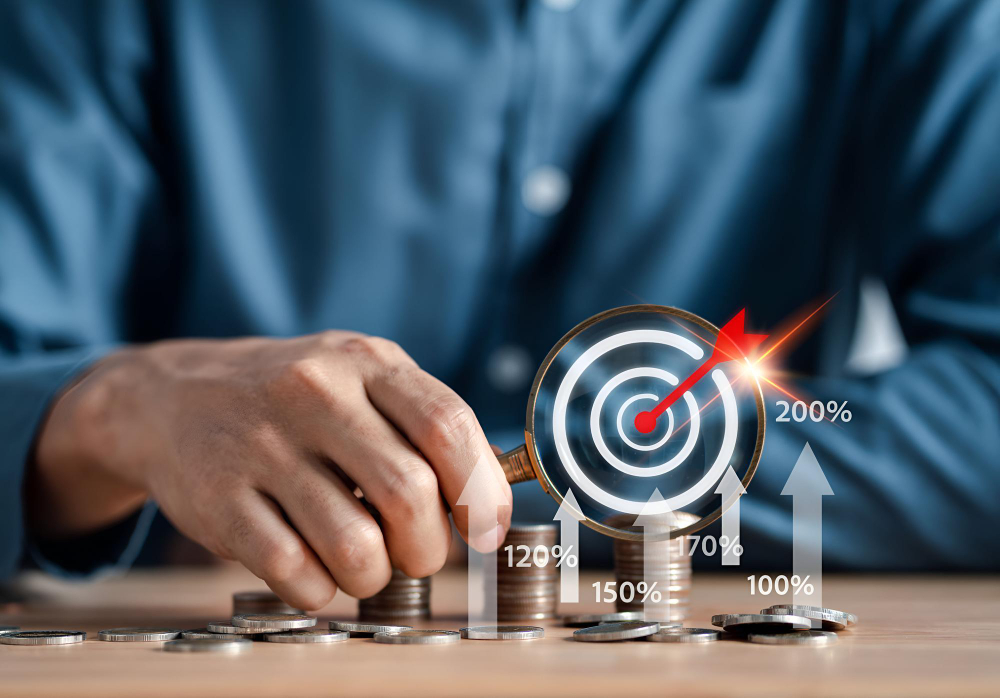 Businessman future target stacking money coins accounting for increase financial interest rate and business investment growth from dividend business finance and money save money concept